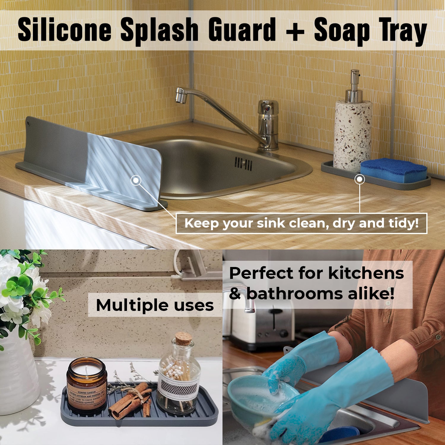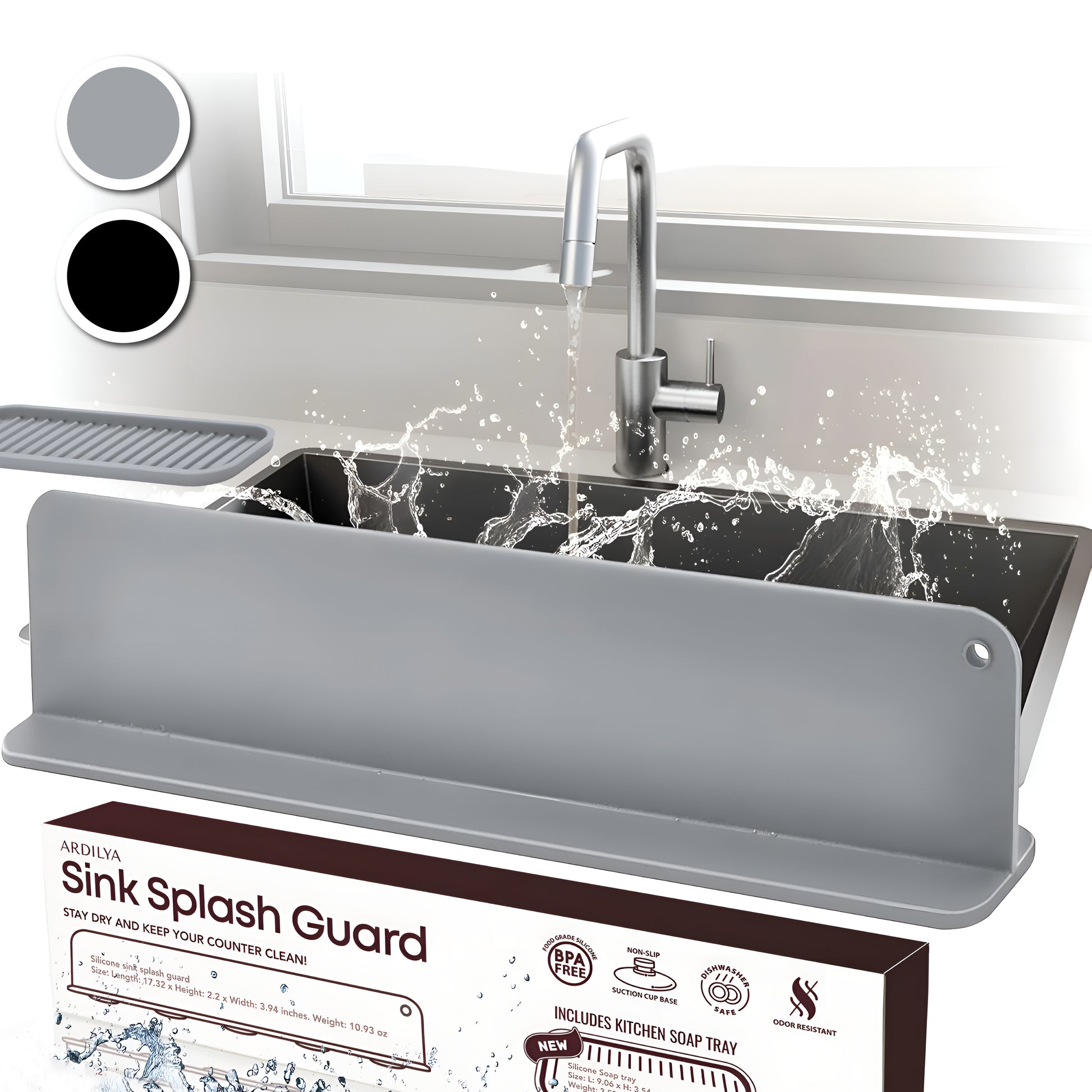 - Multipurpose: Our kitchen sink water splash guard fits behind your faucet, next to your sink, or as a bathroom sink splash guard. Plus, it comes with a silicone soap tray (9.06 x 3.54 x 0.47") to keep everything neat. ADD TO CART NOW!