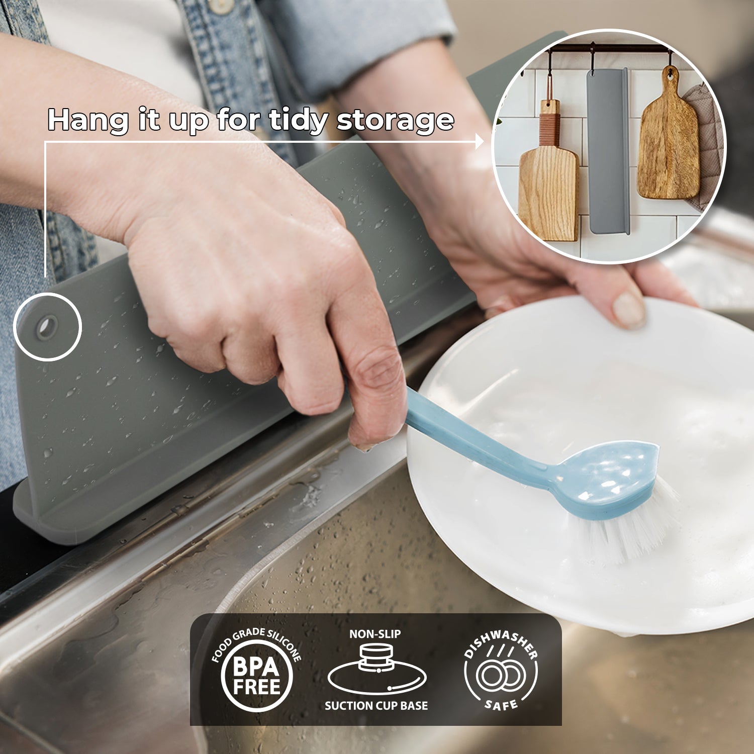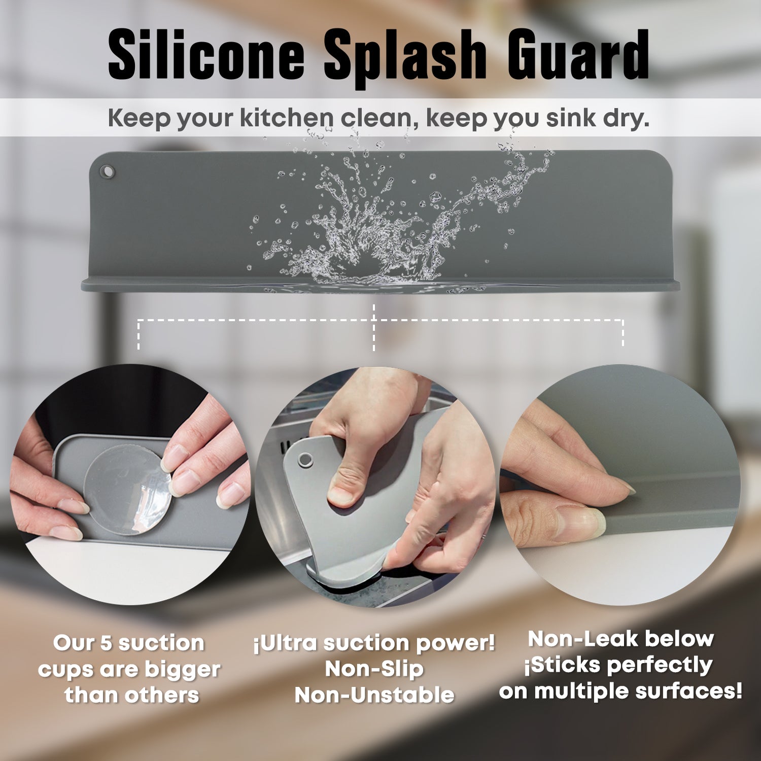 - No more splashing: Our silicone sink splash guard behind faucet protects countertops and floors. Kitchen sink splash guard with 5 strong suction cups that stick securely to smooth surfaces like granite, marble, and laminate